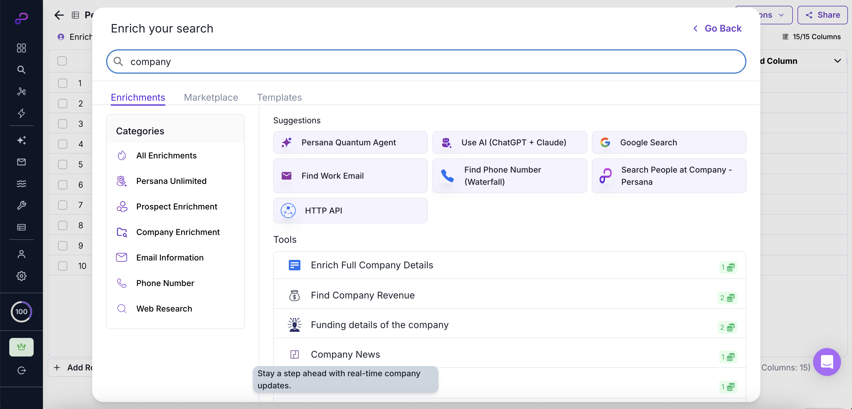 Persana provides 100+ enrichments. For this example, we'll use the following enrichments: