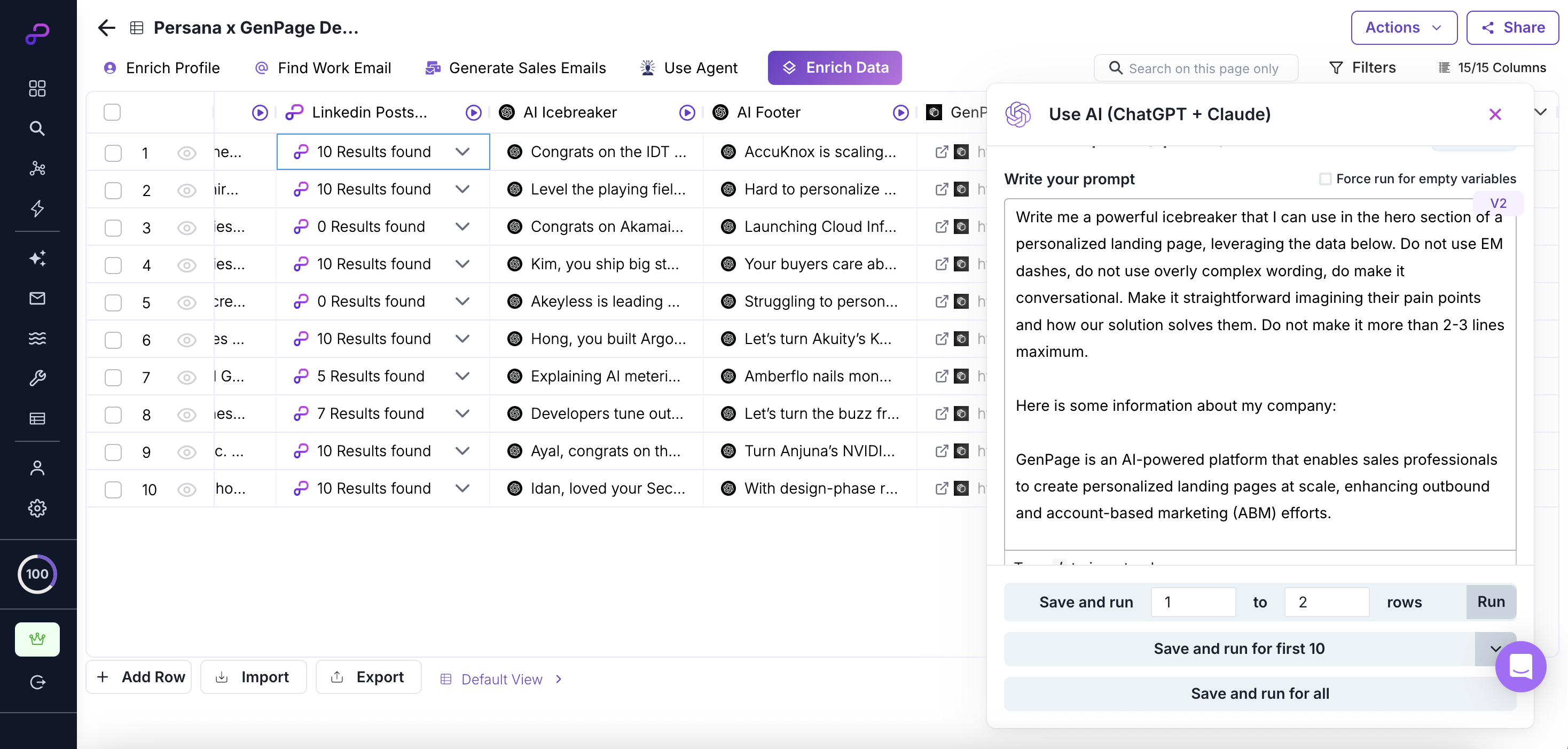 Use Persana’s AI Enrichments to generate messaging based on the context variables created in the previous step. These will then map directly to GenPage variables you can use in sections of your landing pages to display 1:1 messaging for each lead.