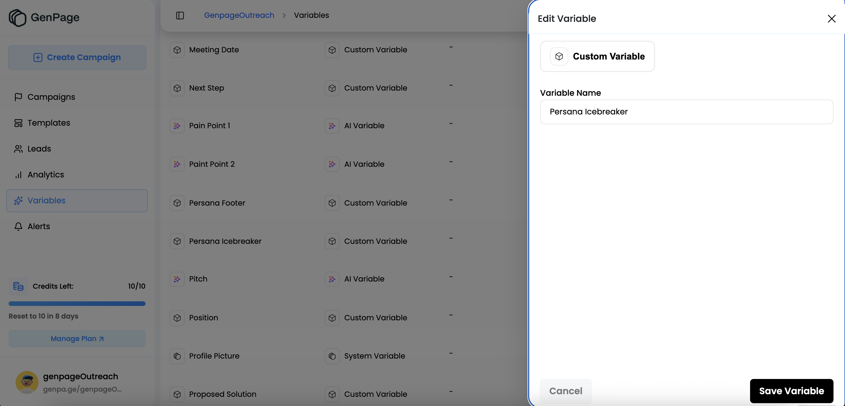 In order to sync our Persana AI variables with GenPage and display them on our landing pages, we'll want to create new variables for all the non "default" variables (such as first name, company name, etc.). In this case, we're creating two new variables: AI Icebreaker and AI Footer.