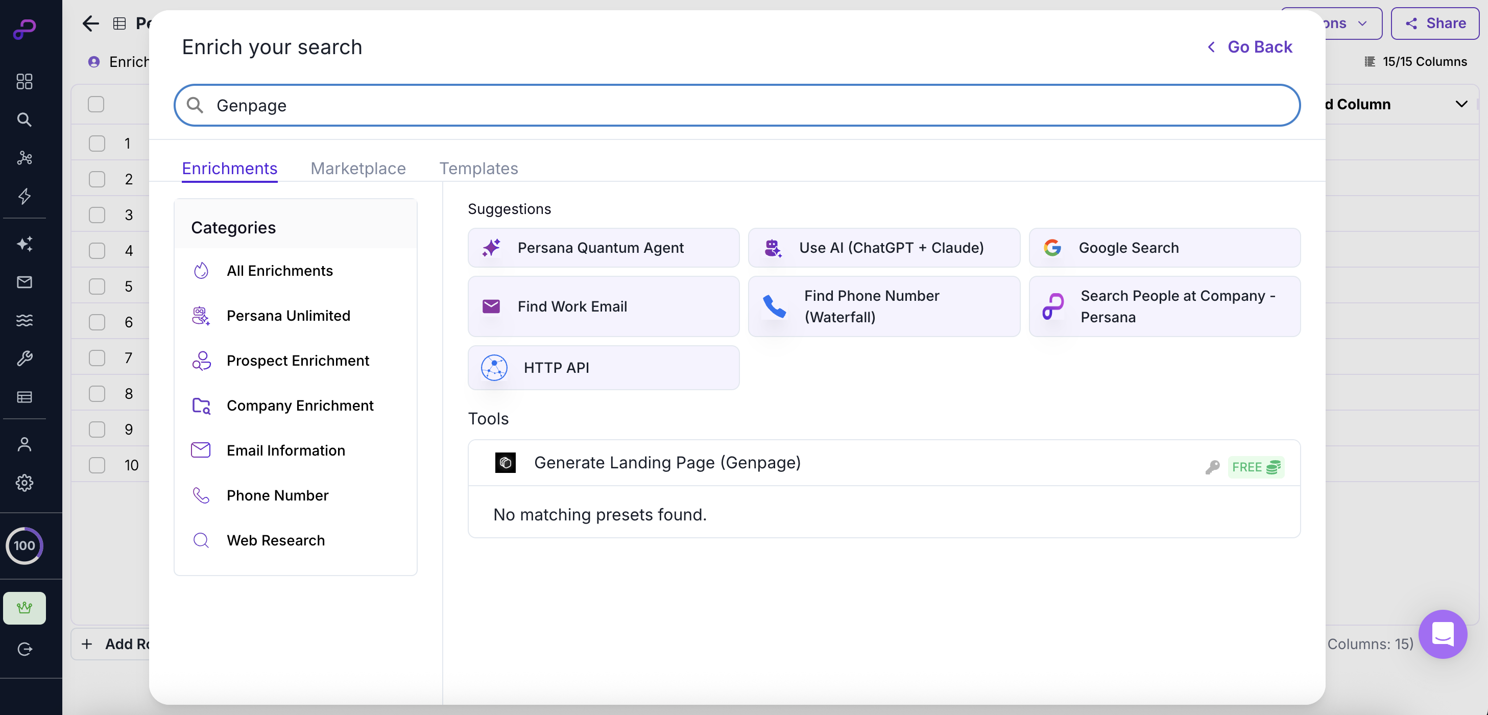 Selecting the GenPage enrichment in Persana AI