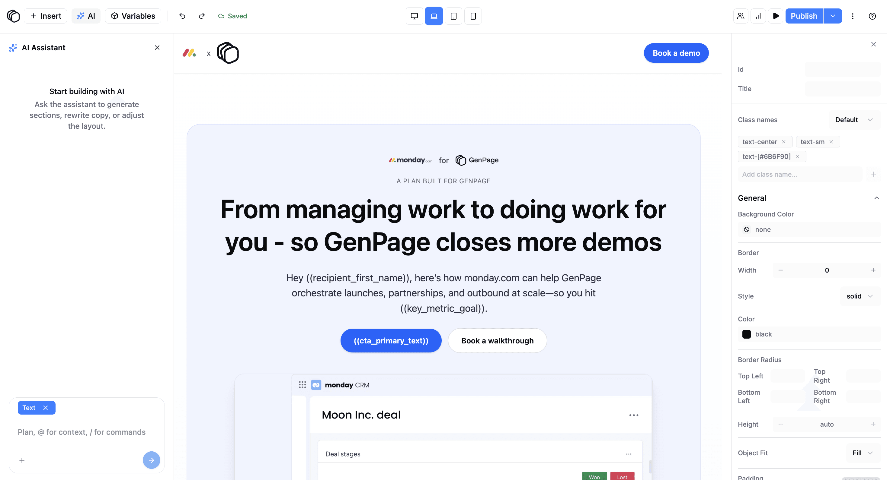 It’s very fast -most pages can be created in under 5 minutes. You can build a page by: Chatting with the AI builder; Starting from a prompt; Copying an existing page from a website URL; Importing a file such as a sales PDF or one-pager; Using templates and pre-made blocks. This makes it easy to launch personalized pages at scale without design or dev work.