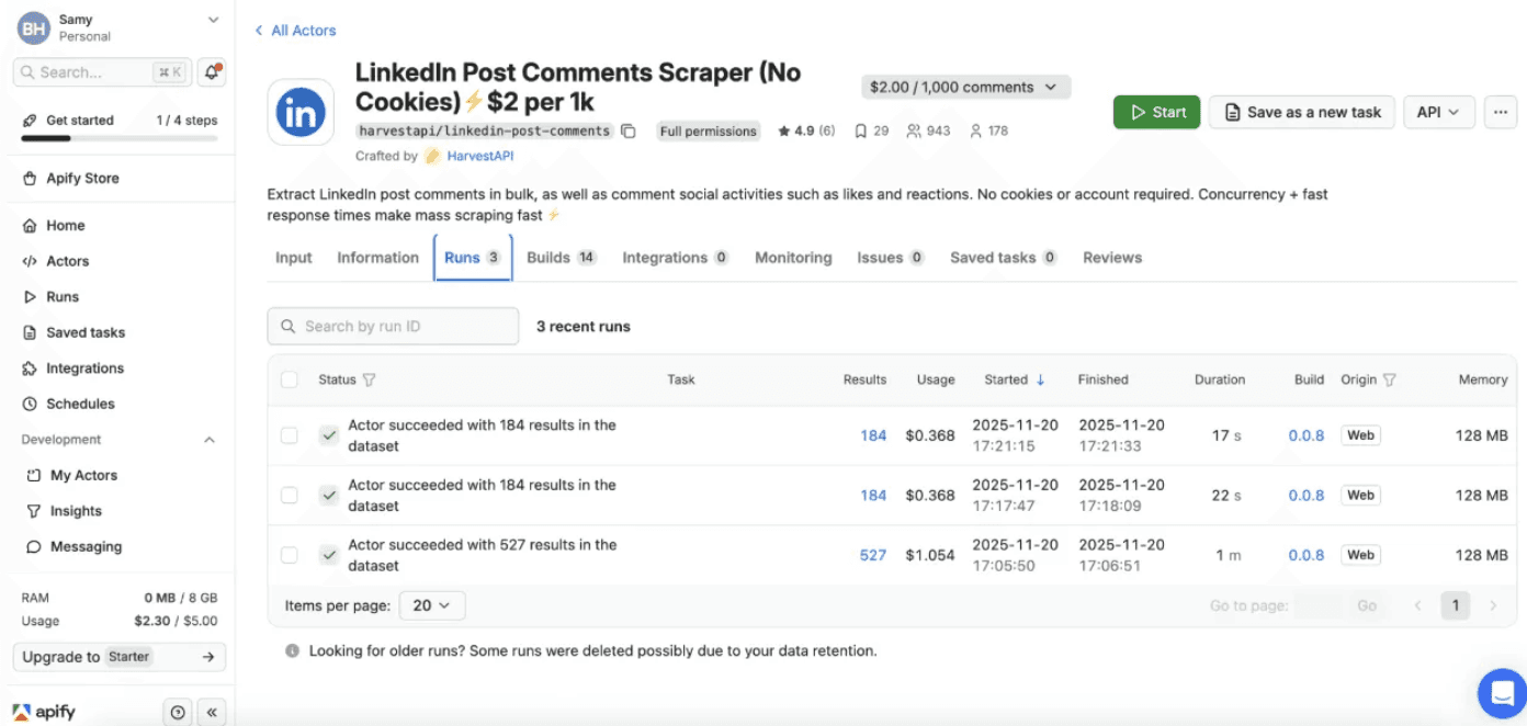 2. Commenters → using this Apify LinkedIn Comment Scraper
