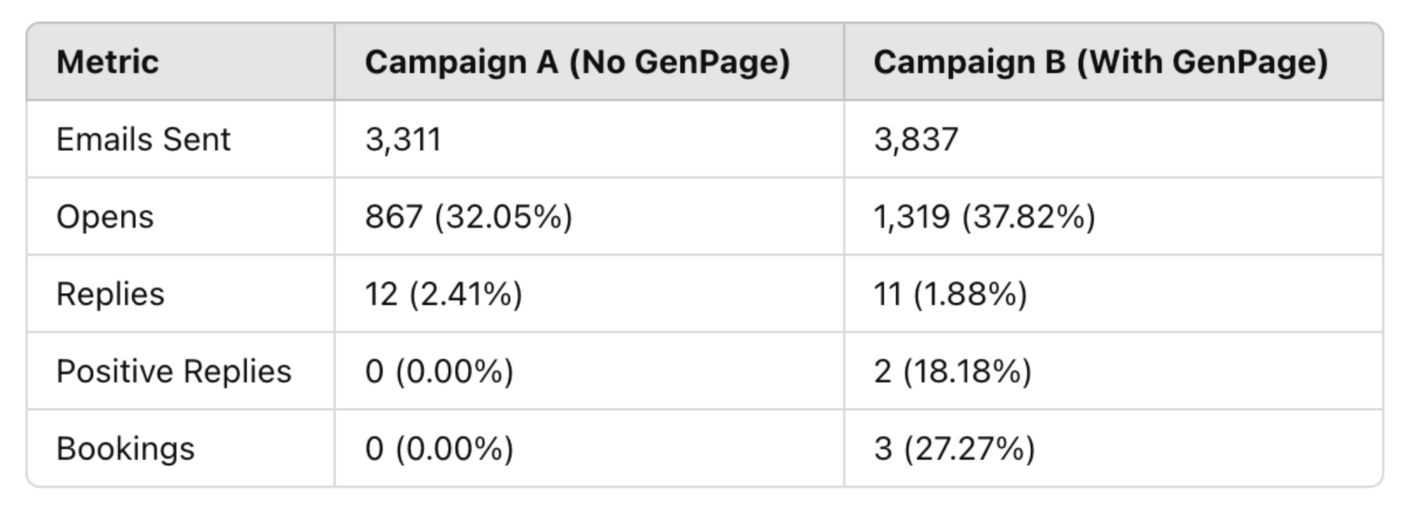 LeadCat ran a true A/B test where the only change was adding a GenPage link. By sending each prospect to a personalized page, their outreach felt more intentional and relevant, resulting in 3x more booked meetings and two new clients closed.