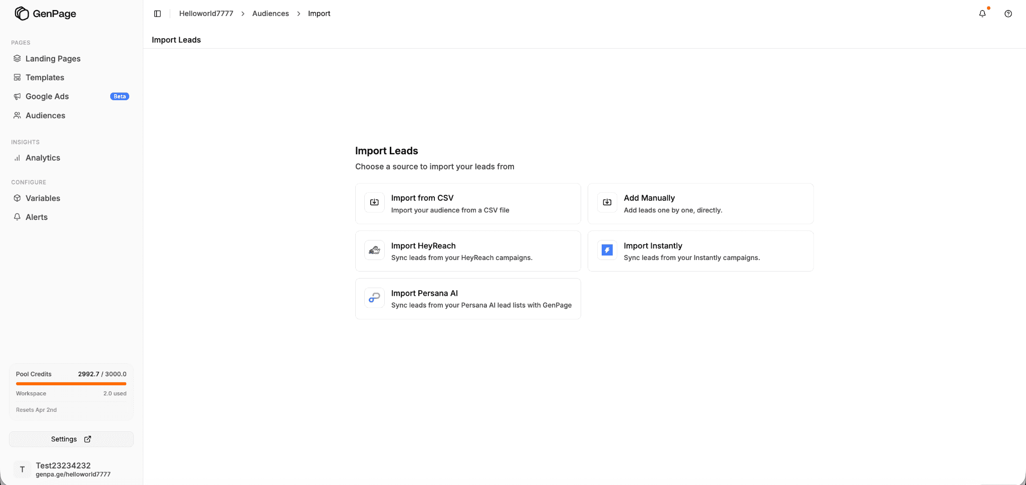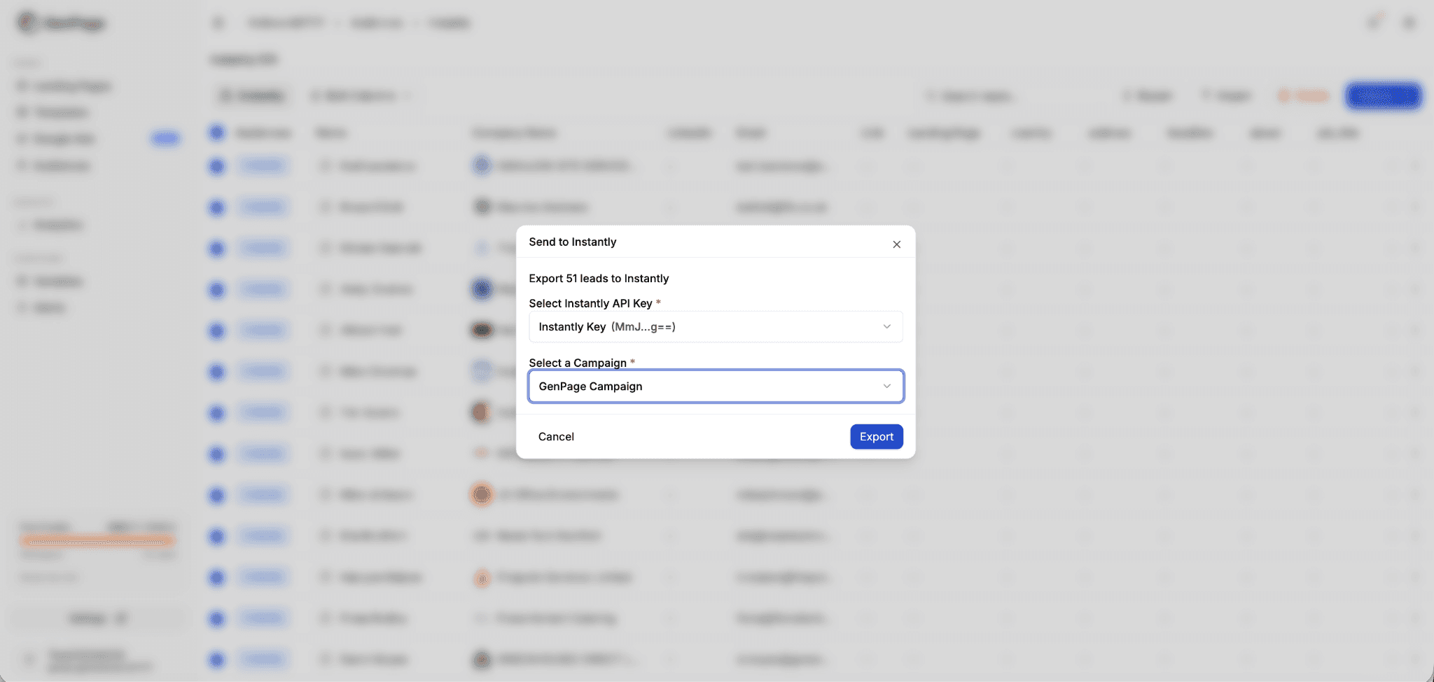 After connecting the integration, you can import leads directly from your Instantly campaigns into GenPage and automatically generate personalized landing pages for each prospect.
