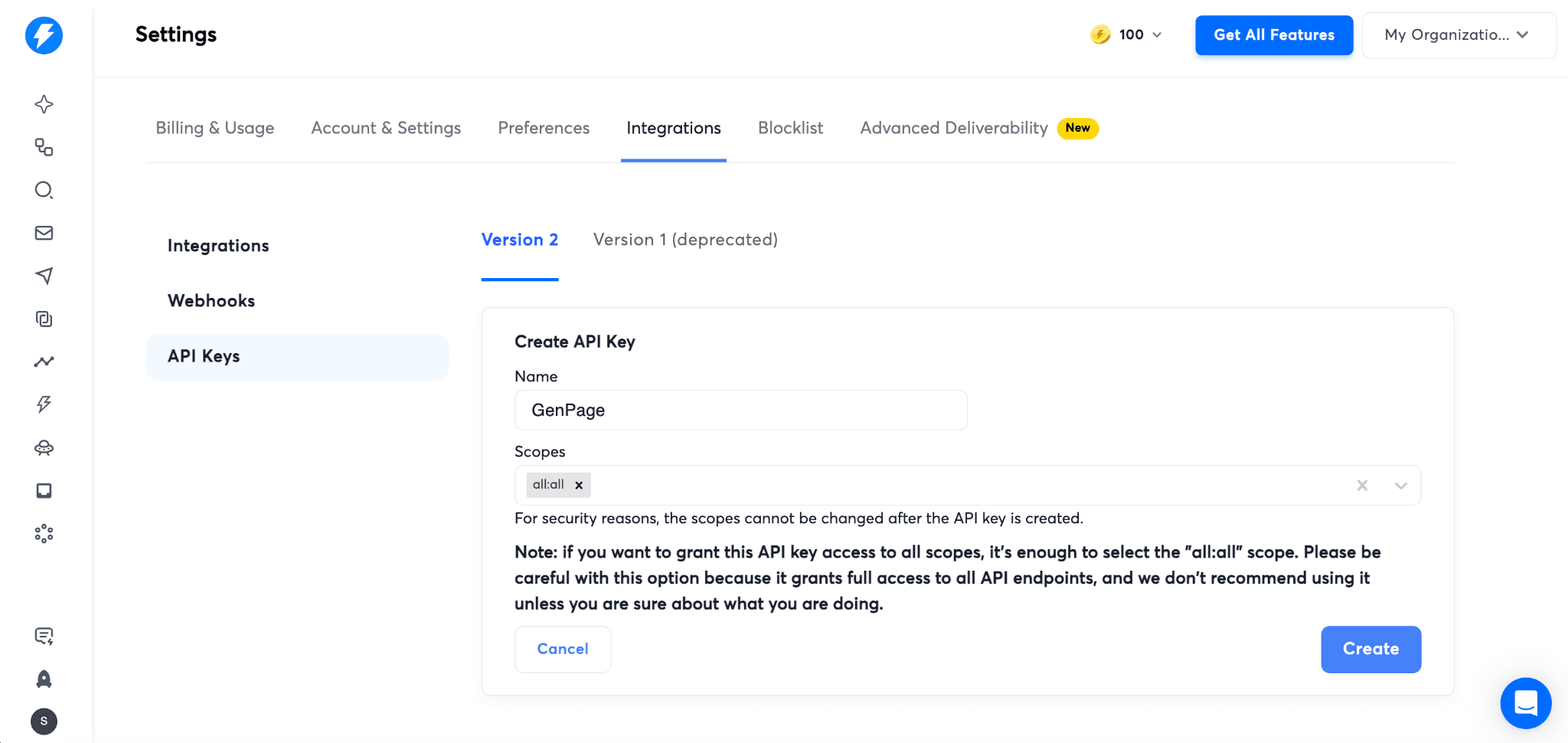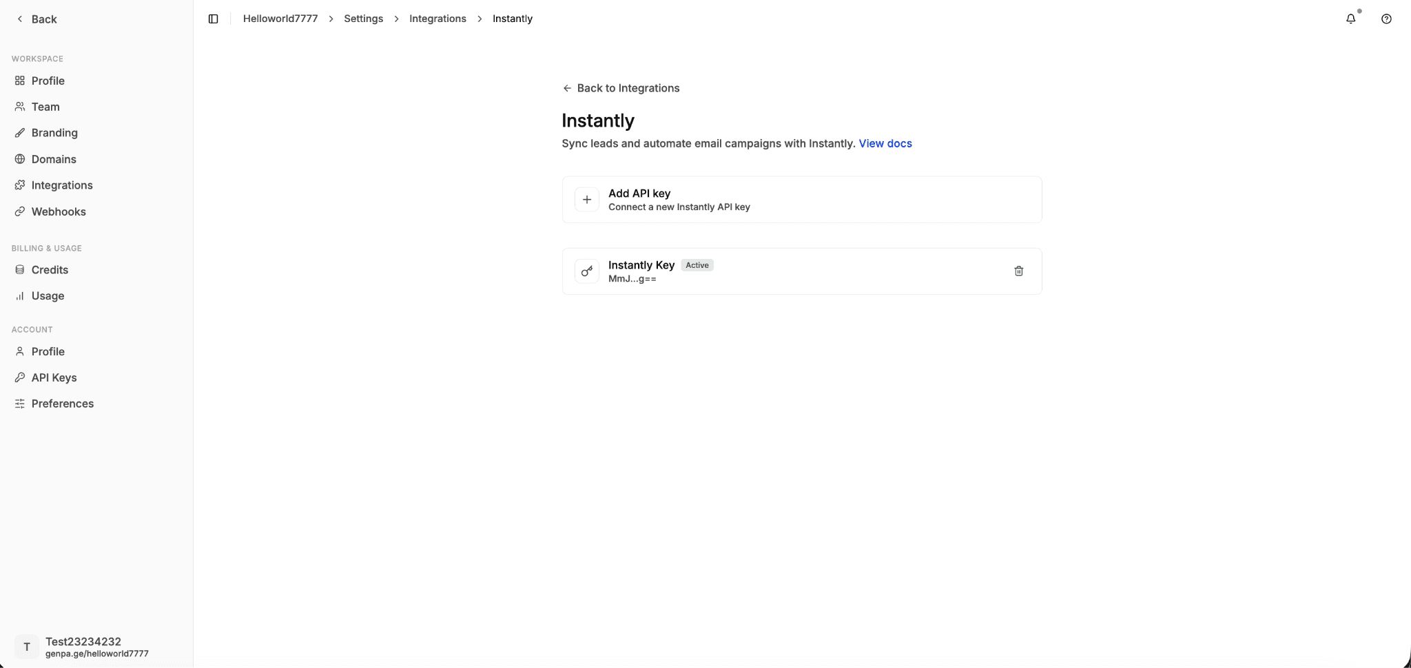 Once your API key is created, connect Instantly to your GenPage workspace.