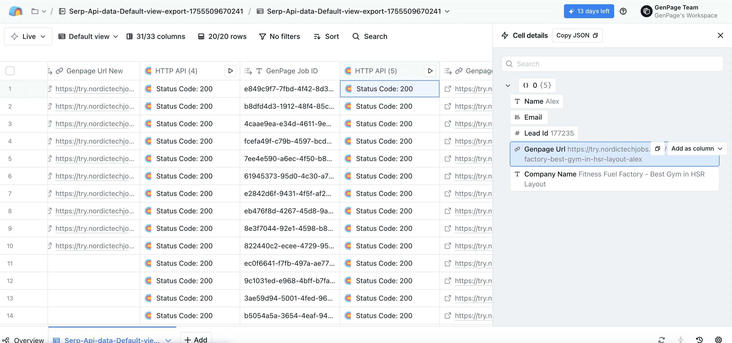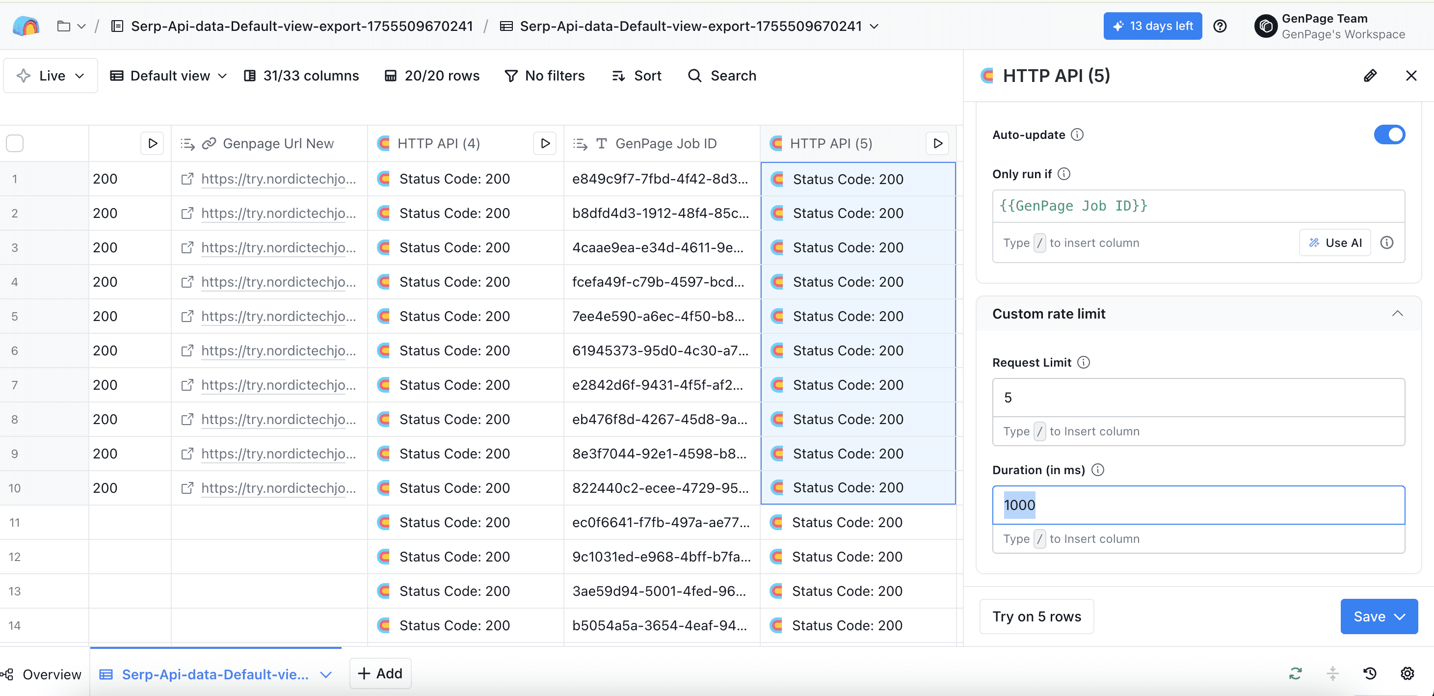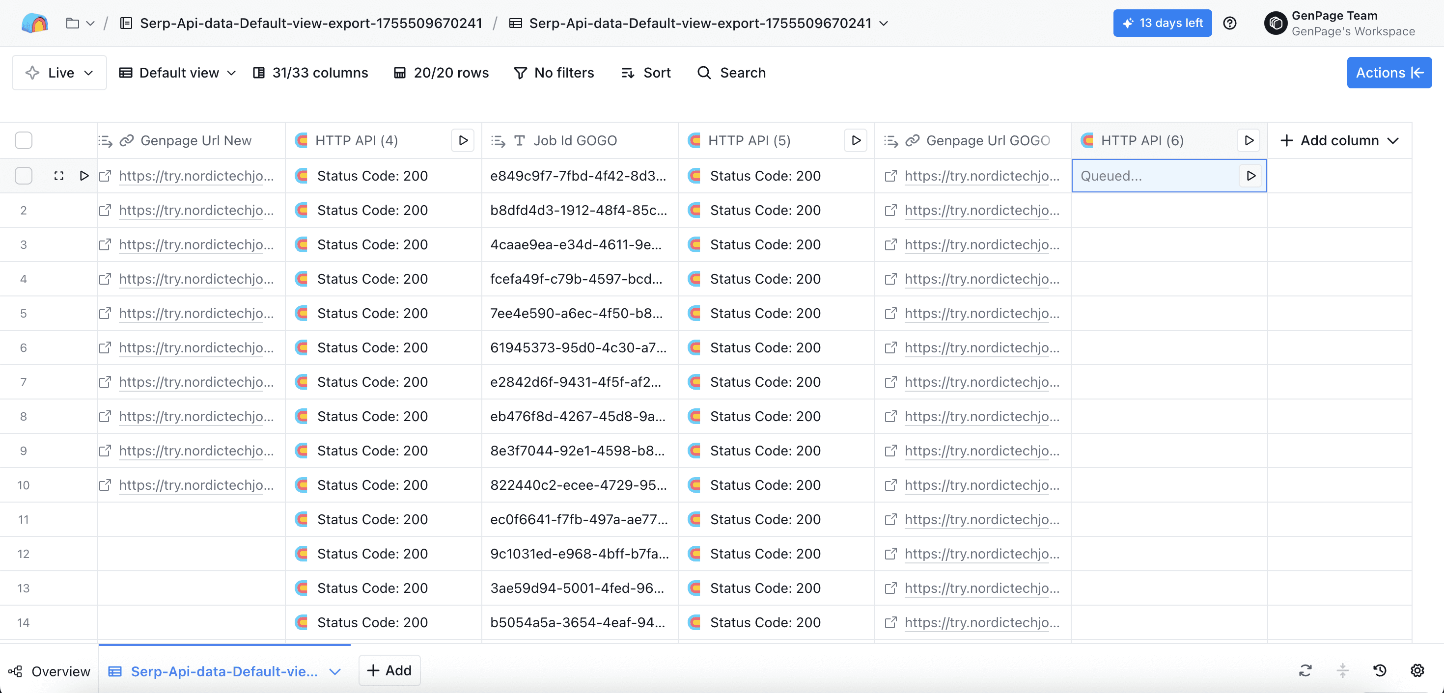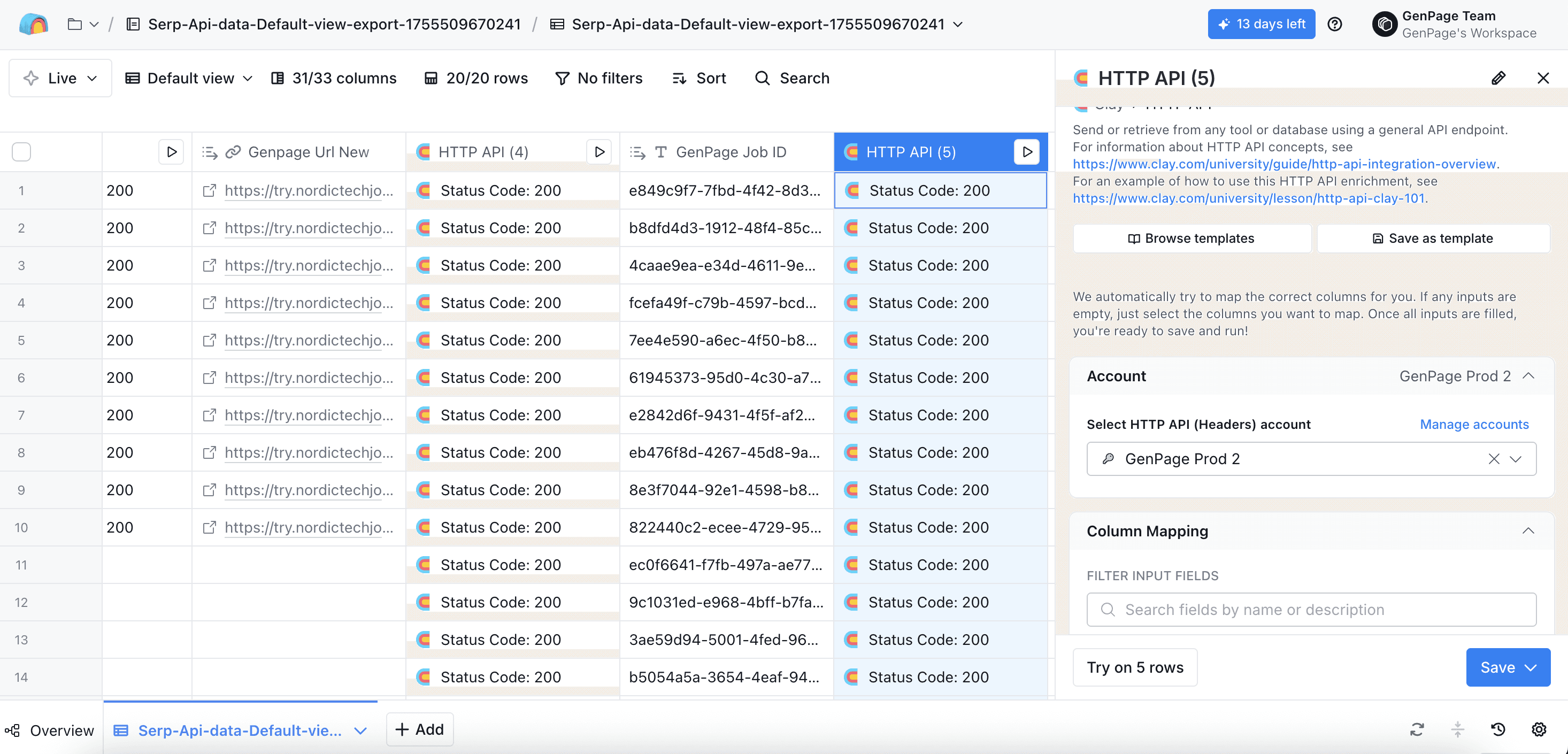 Head back to the very first HTTP API column you created, and click run all rows. All other columns will populate automatically, including your new column with your GenPage URL: