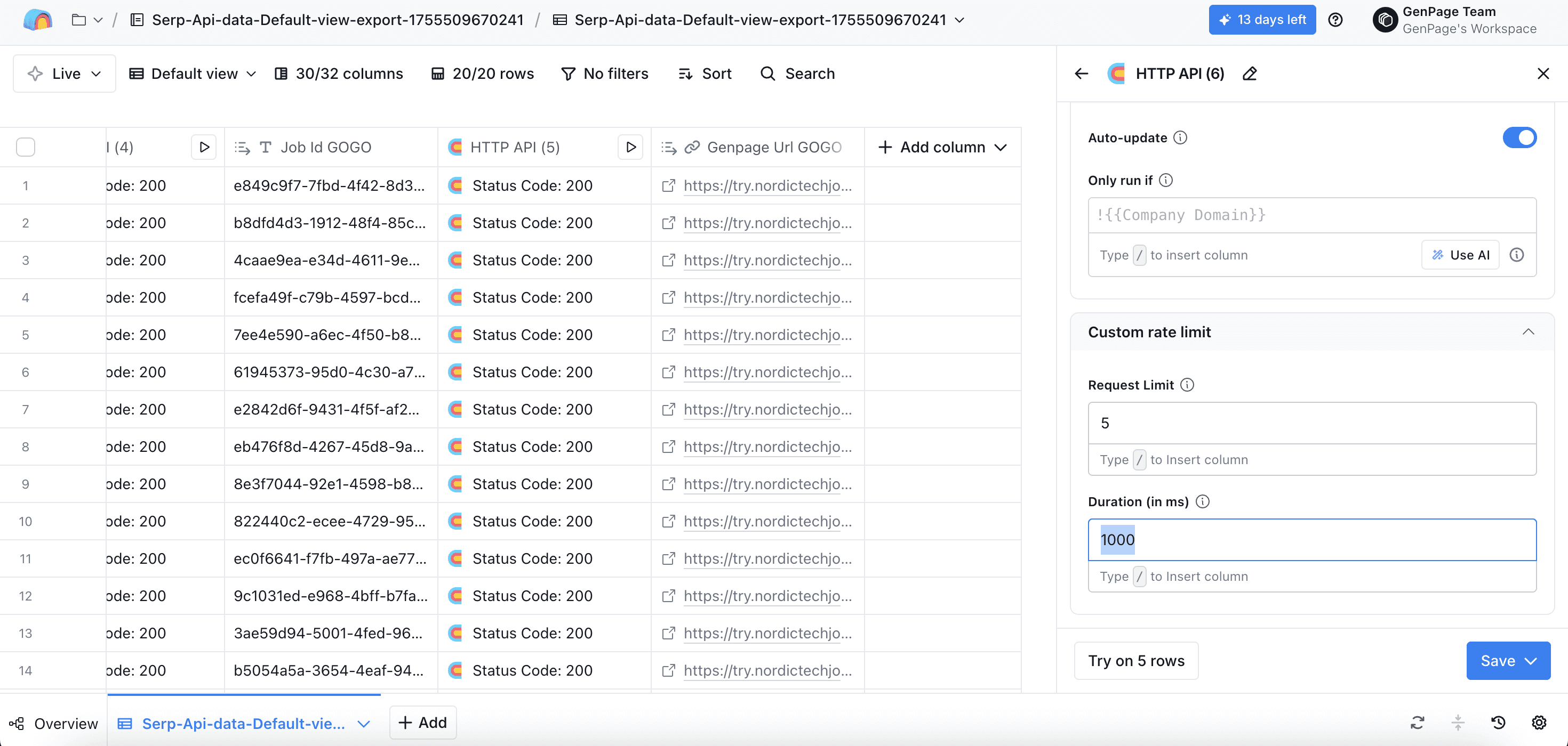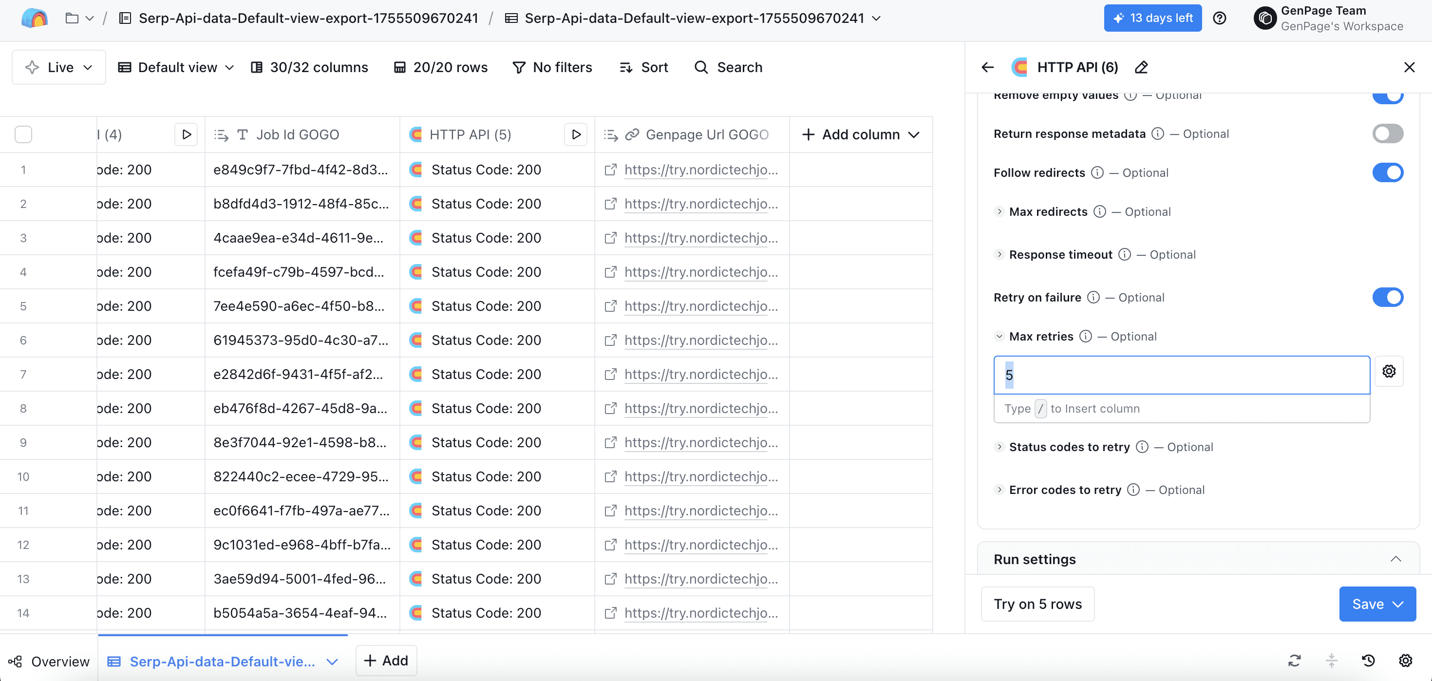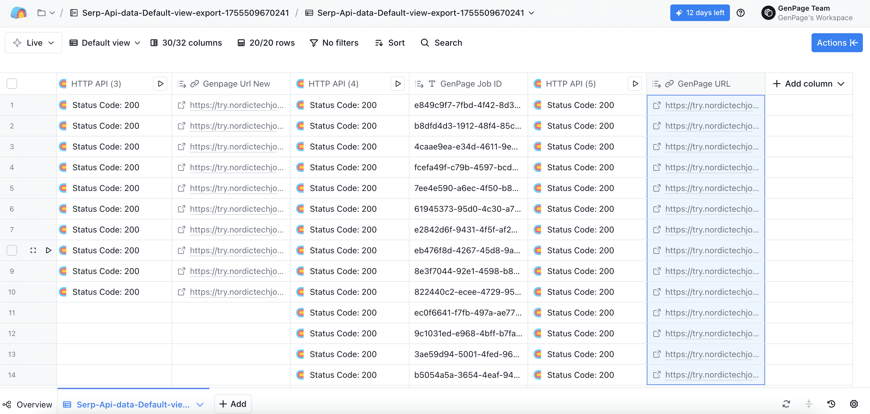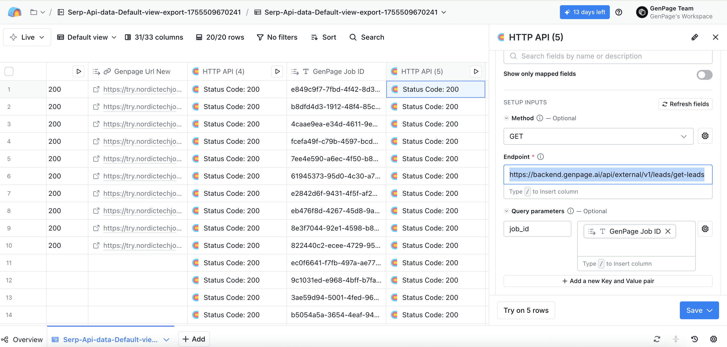 Head back to the very first HTTP API column you created, and click run all rows. All other columns will populate automatically, including your new column with your GenPage URL:
