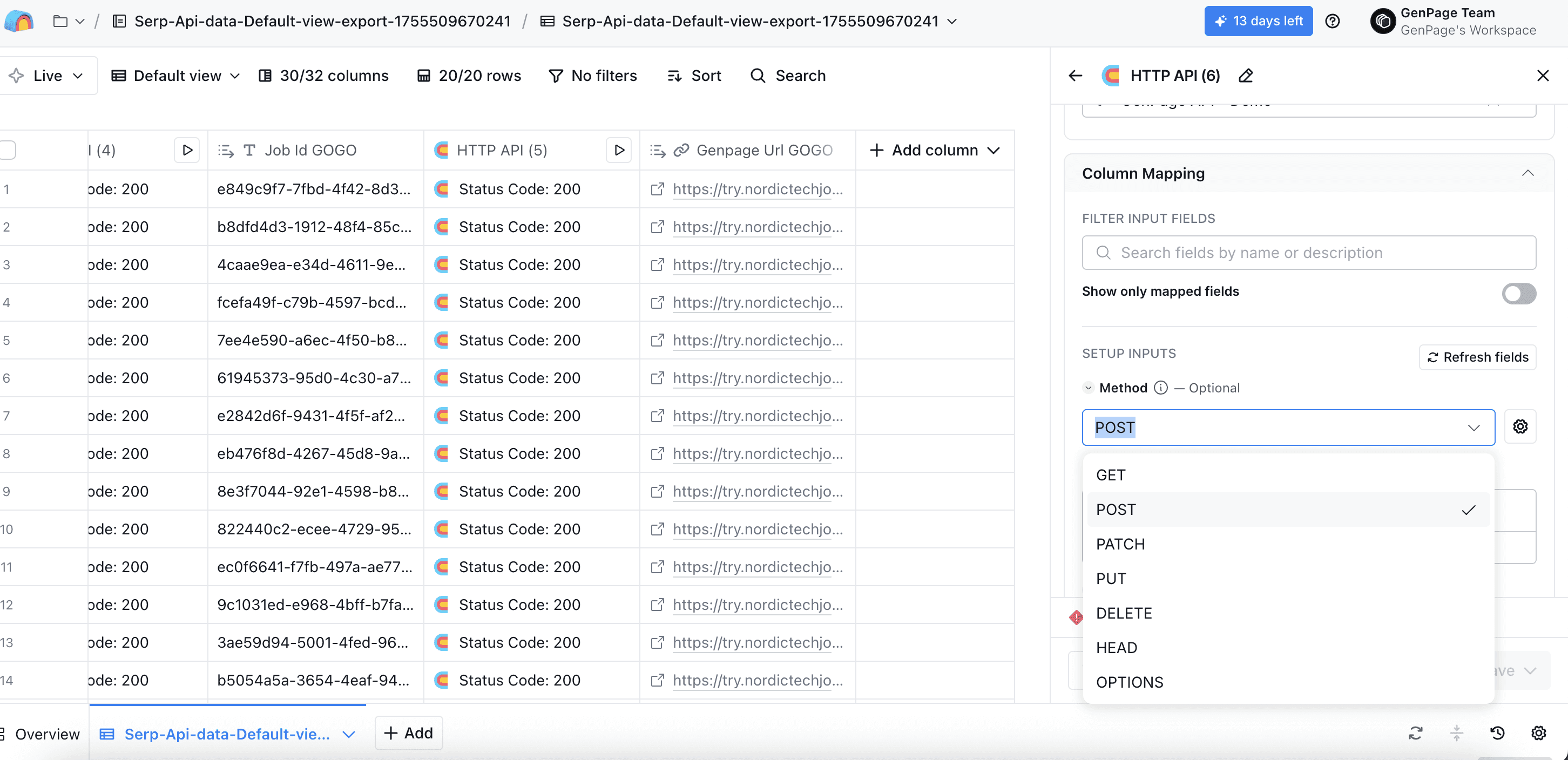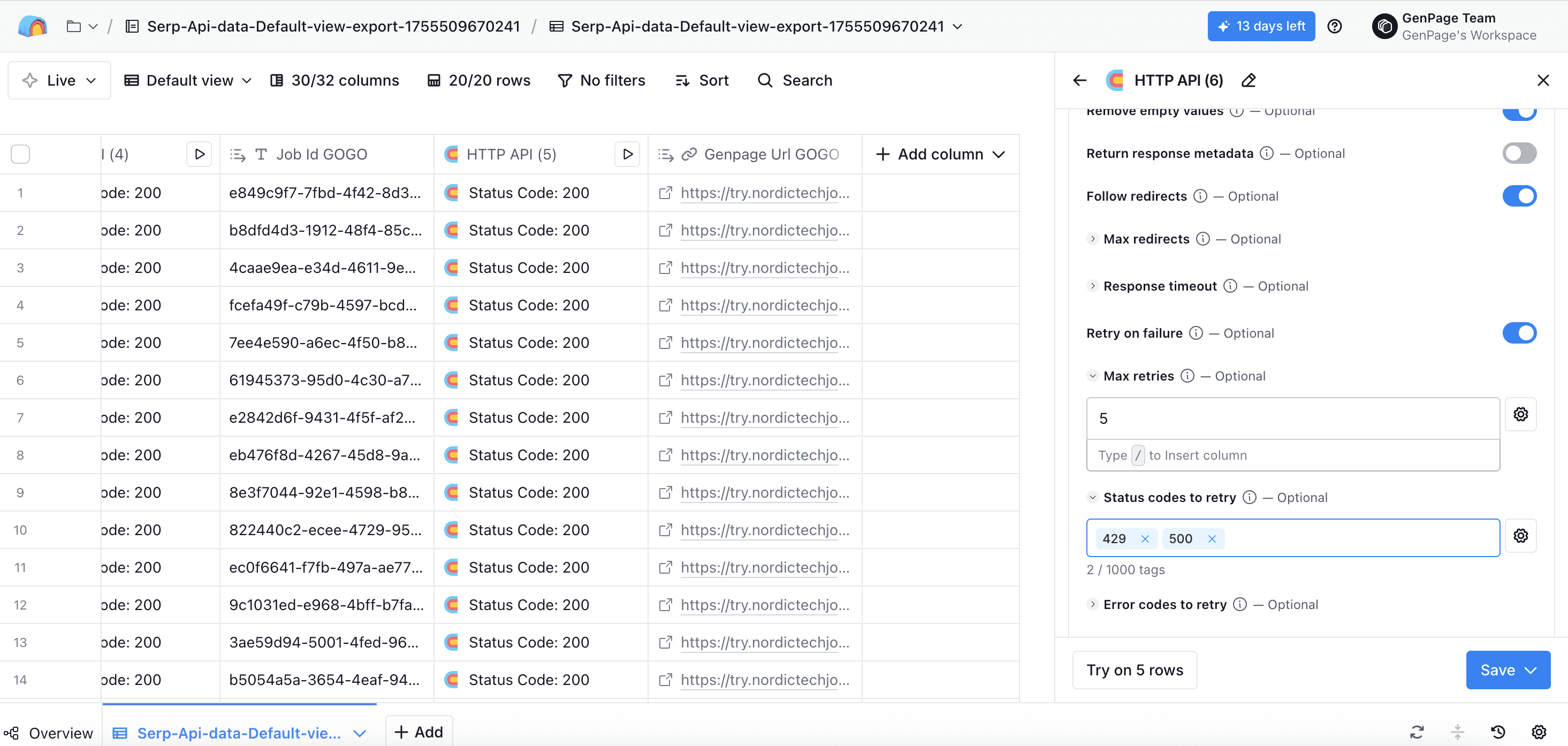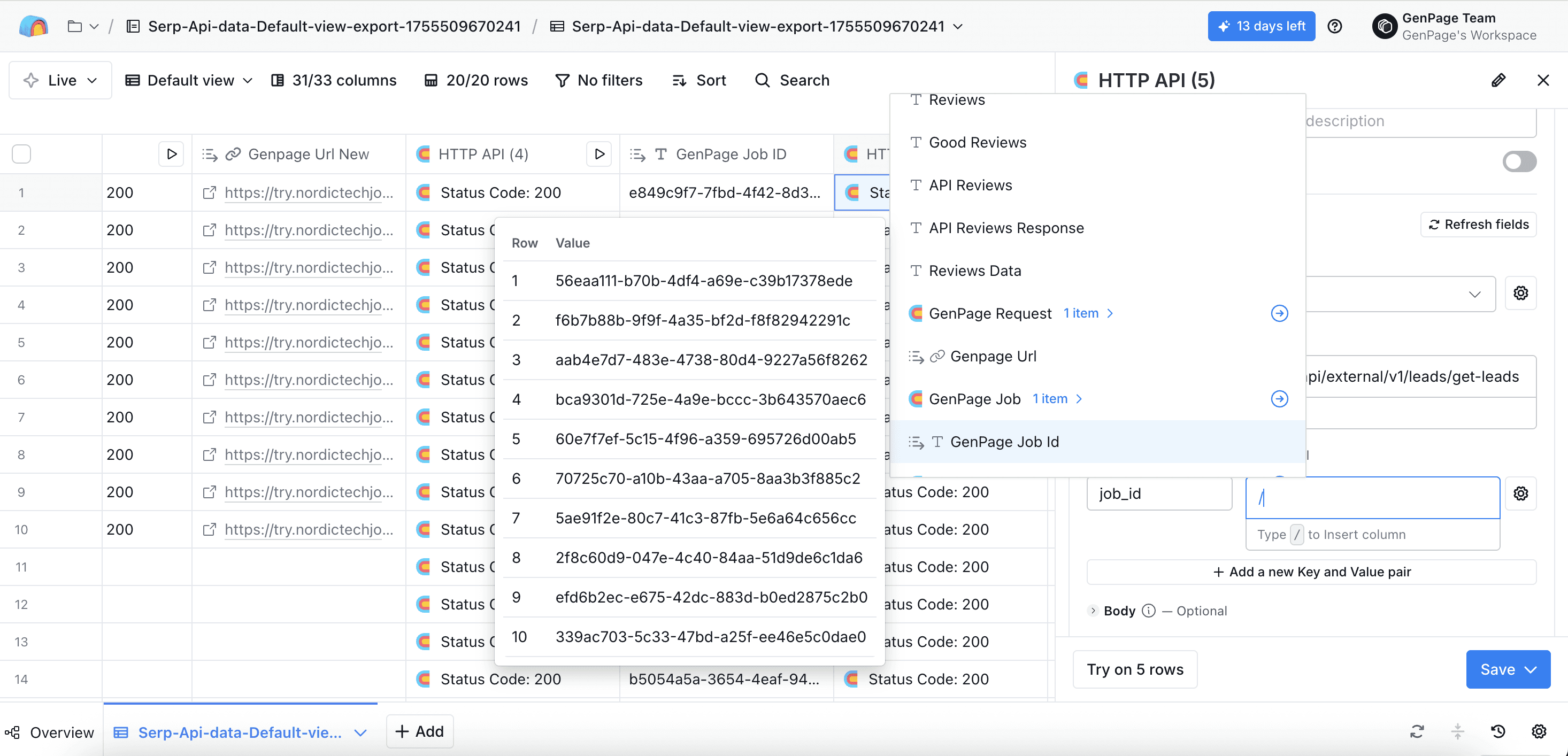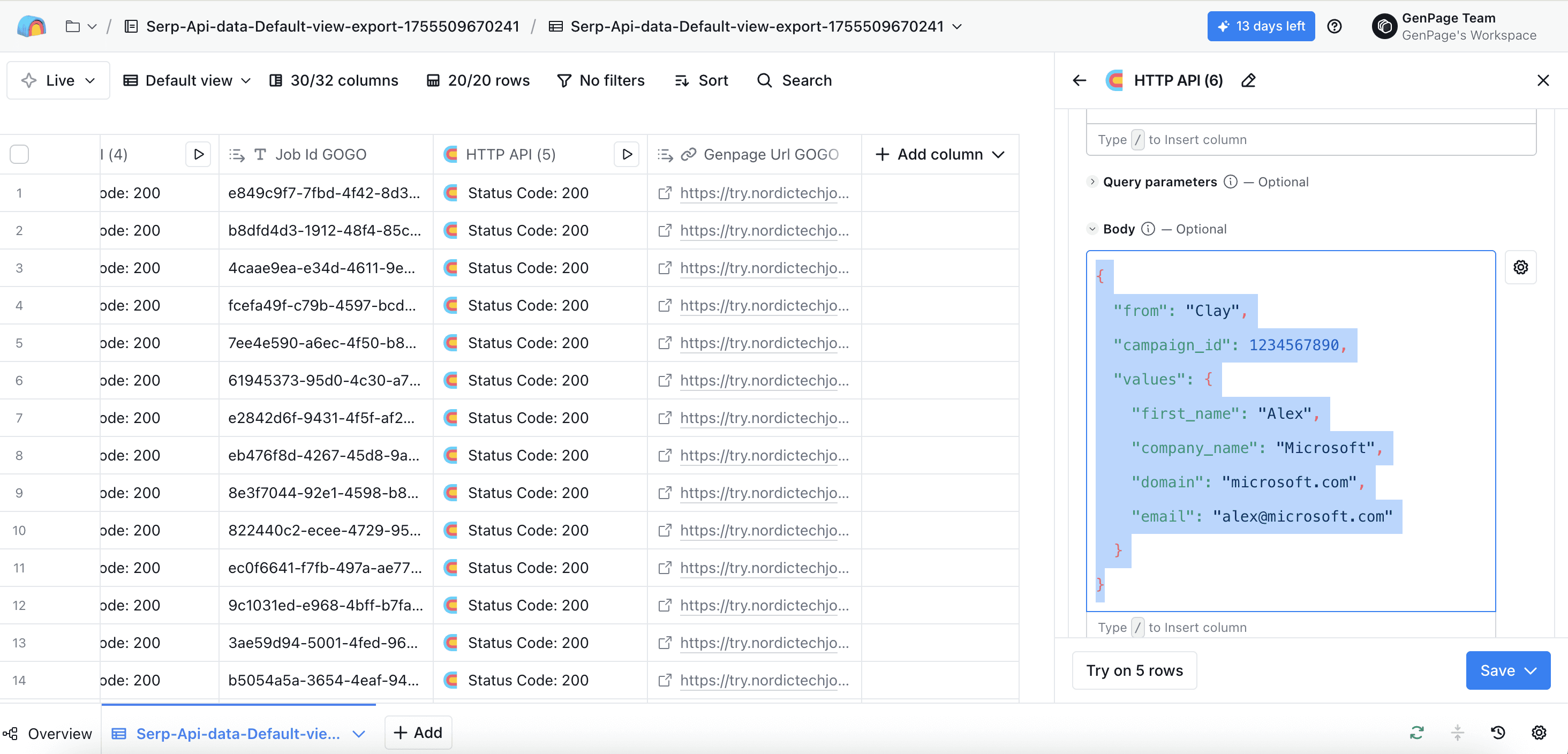 Head back to the very first HTTP API column you created, and click run all rows. All other columns will populate automatically, including your new column with your GenPage URL: