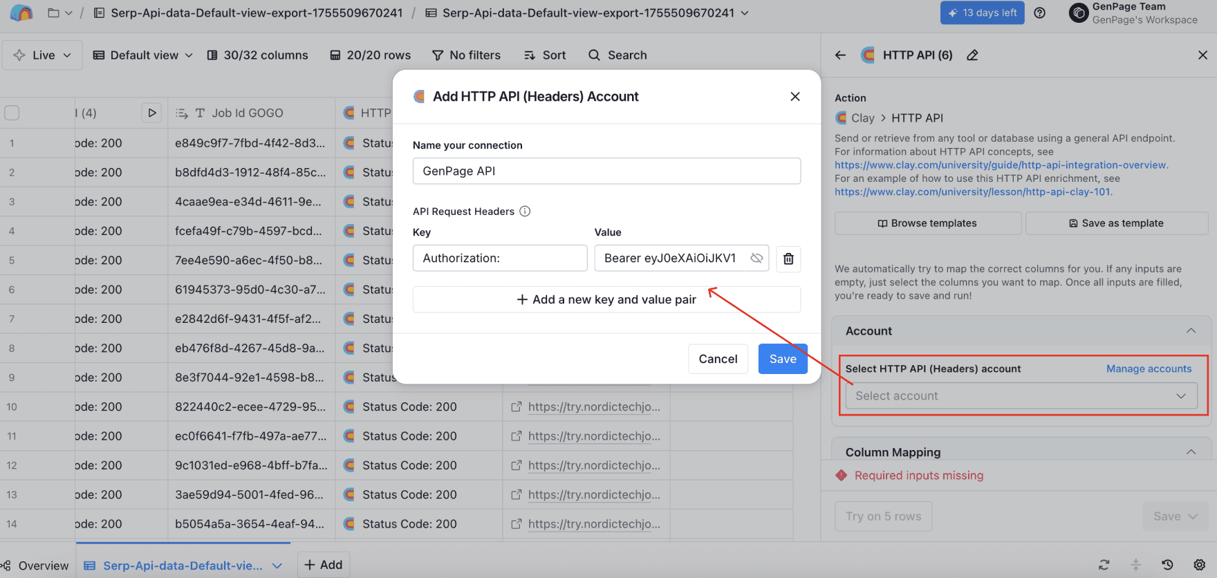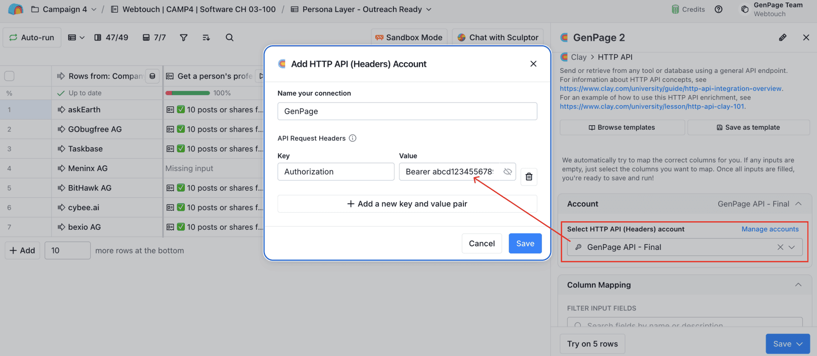Adding GenPage as an HTTP API (Headers) Account in Clay
