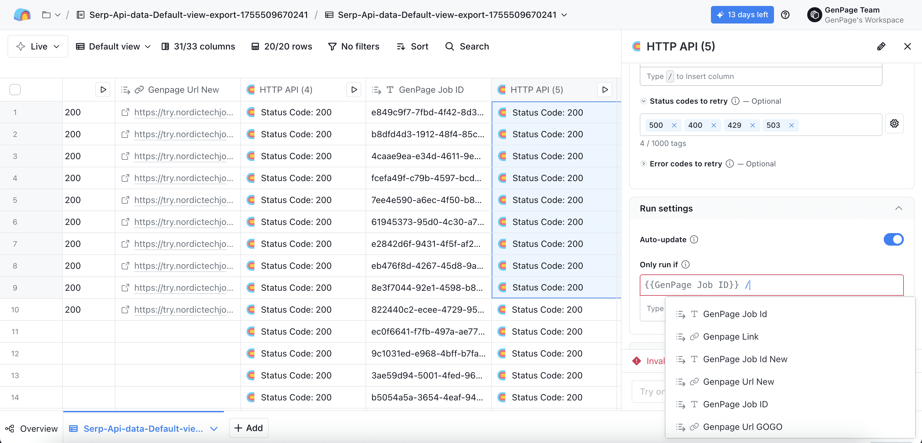Make sure "auto update" is toggled on, and under "only run if" field, type "/" and search in the dropdown to add the "GenPage Job ID" column: