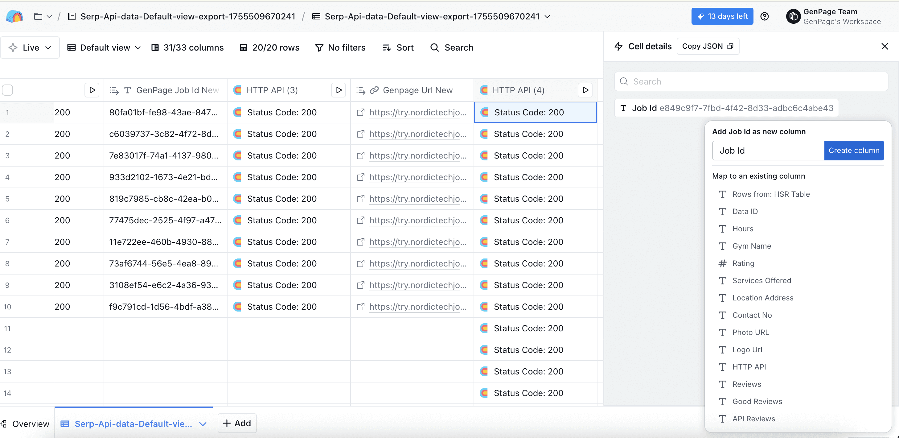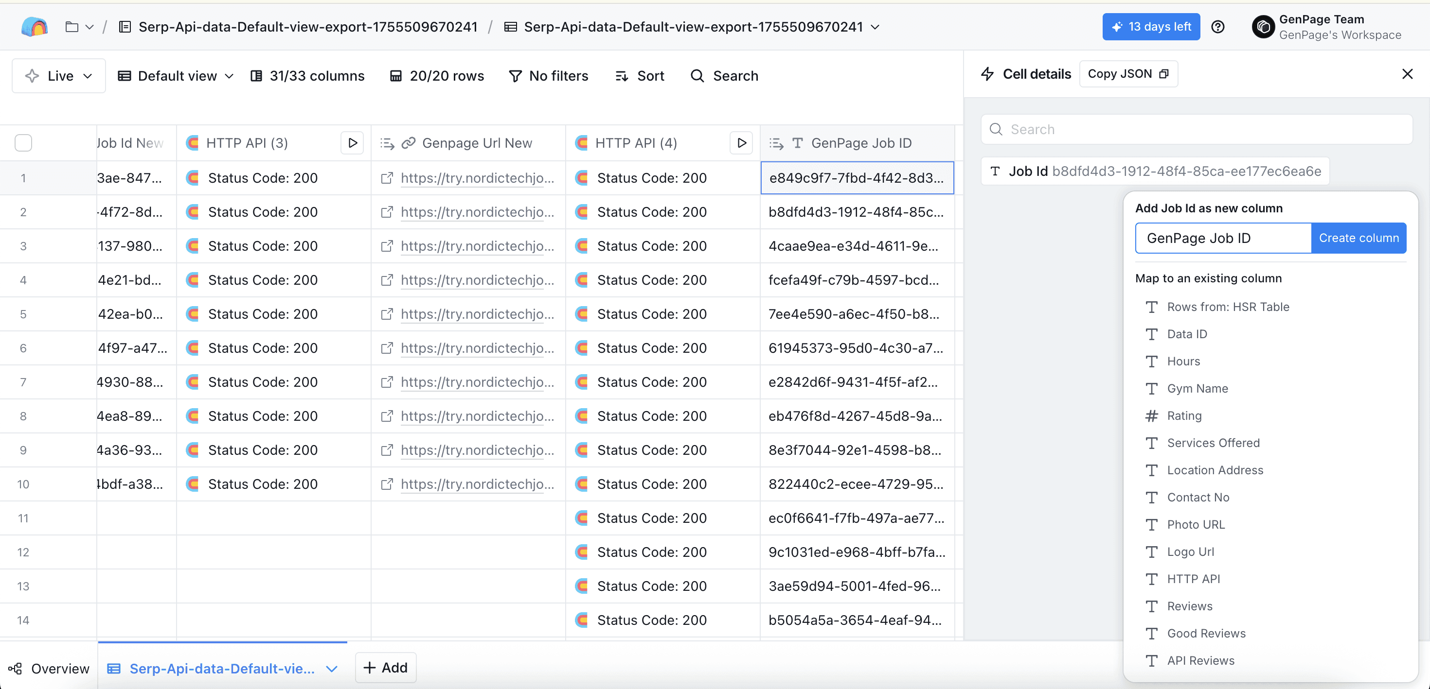 Click on the job ID, select "Add as column", and save a name for the column suche as "GenPage Job ID":