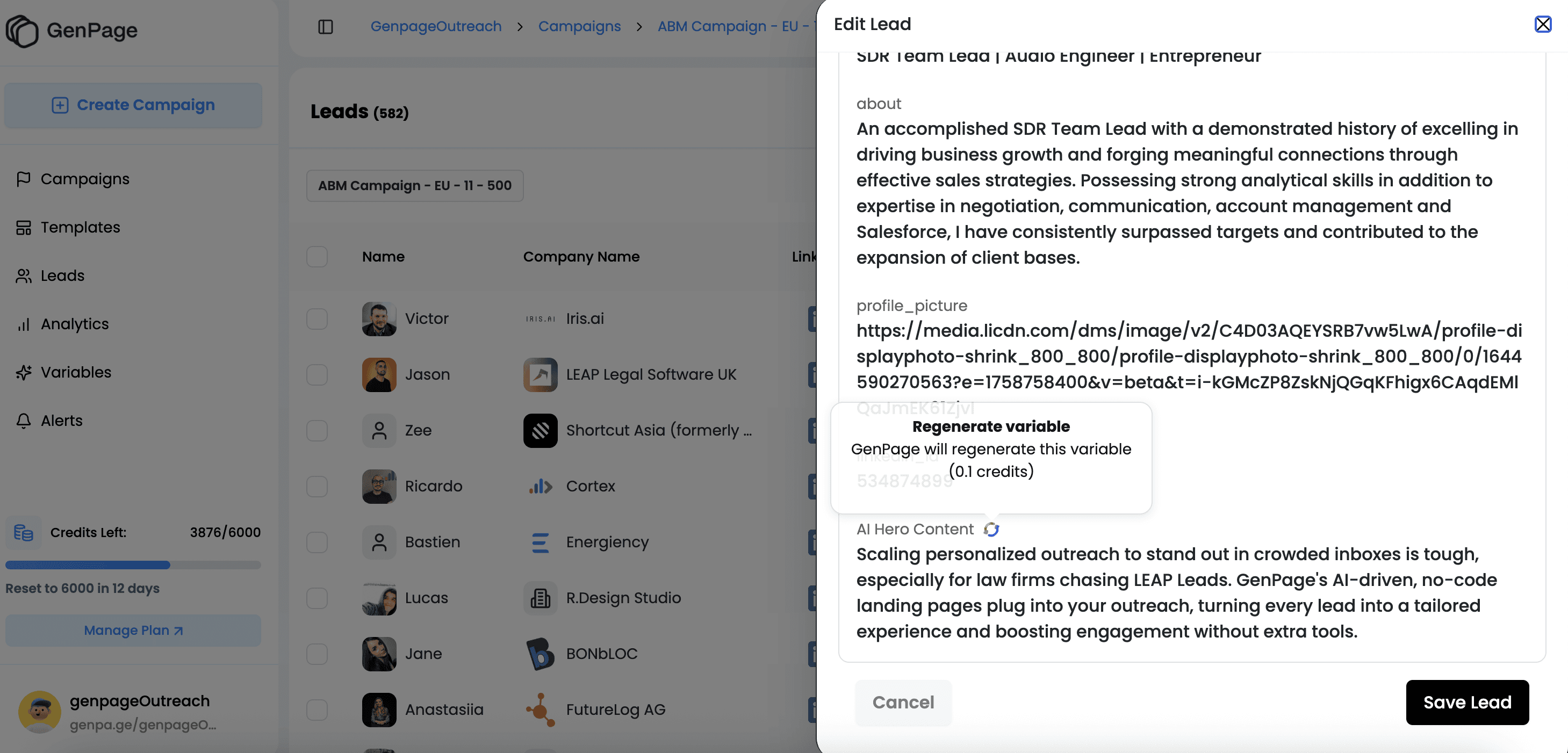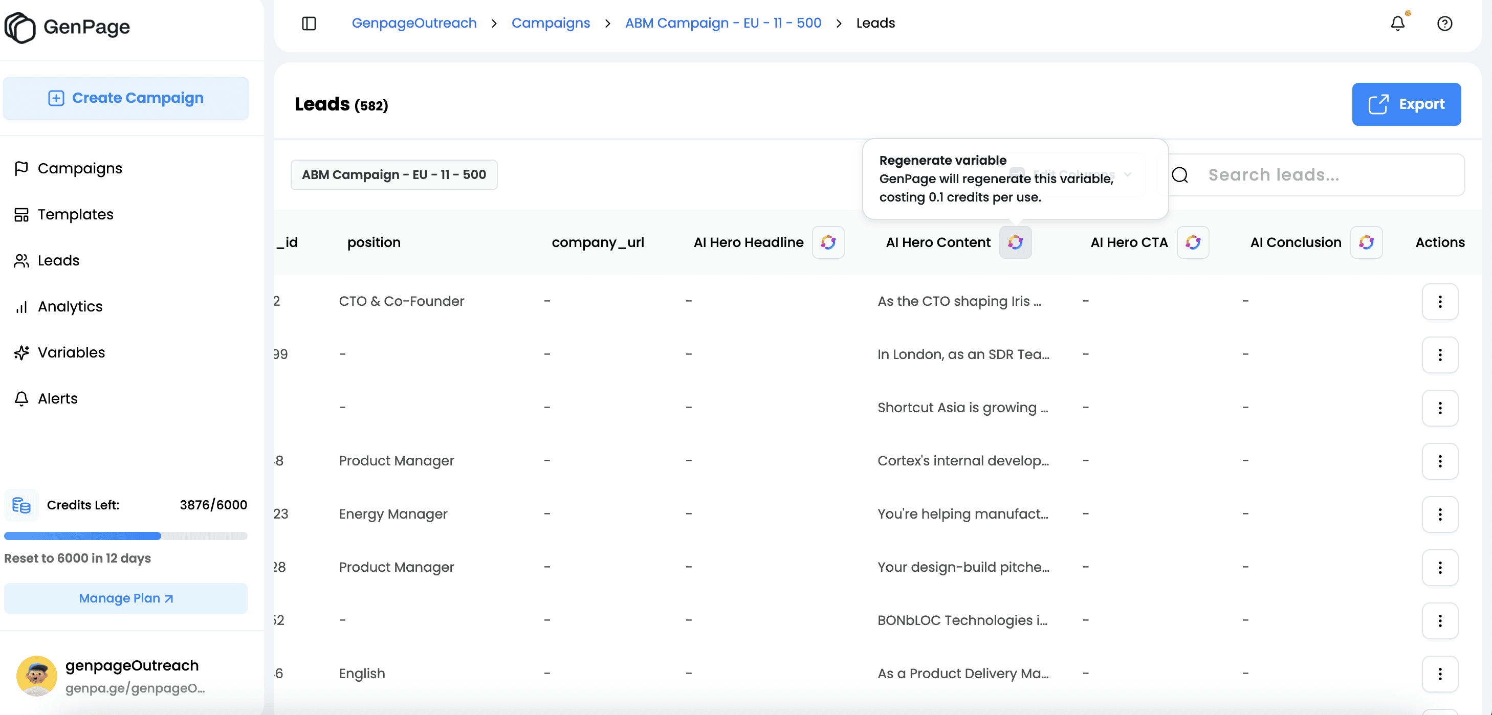 Once you're confident your AI variables + landing page layout looks good, you can generate the AI variables accross your whole lead list