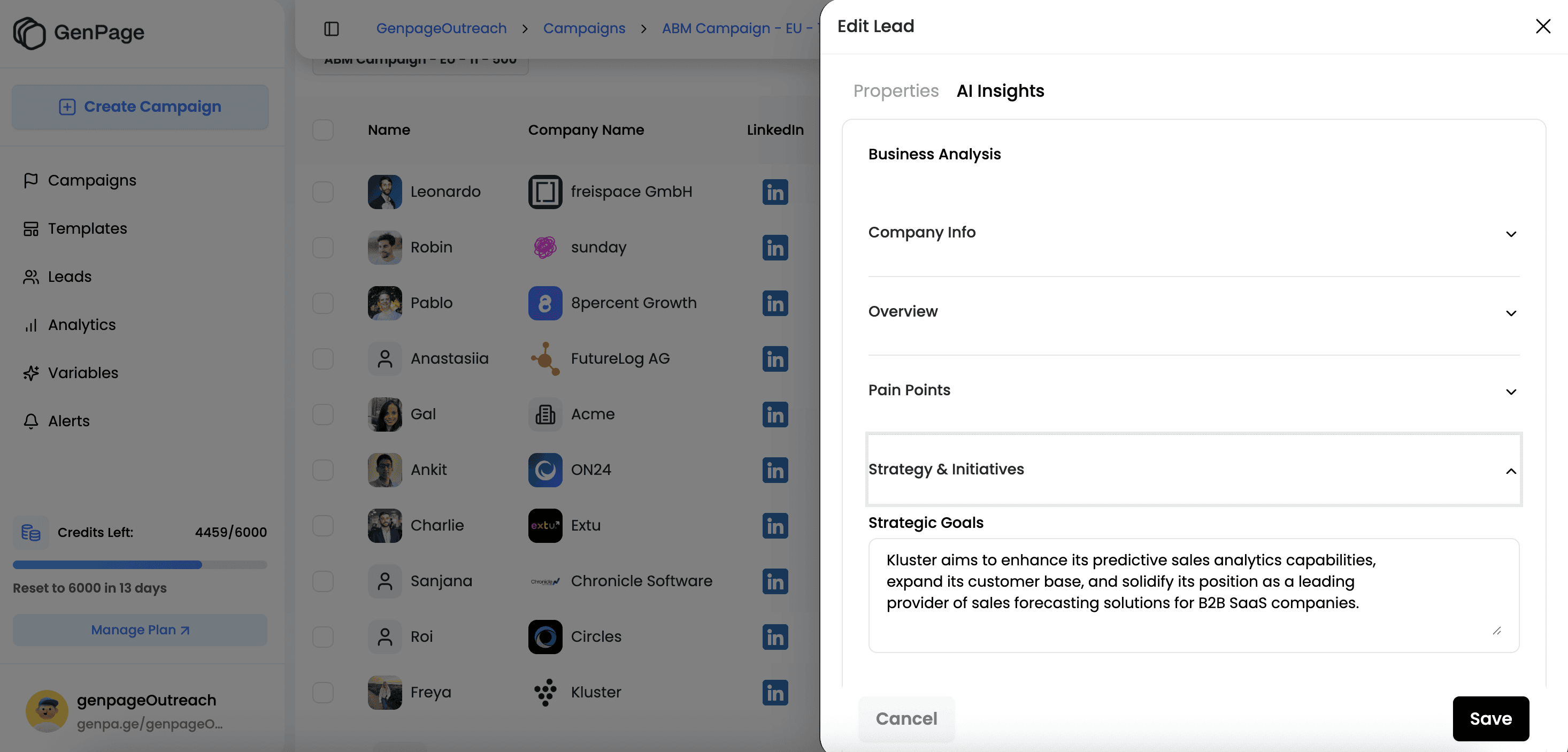 GenPage's engine will use deep AI search to build your lead's AI Insights profile, with information about both the lead themselves and their company. This includes a general overview of the prospect's company, as well as infers typical pain points and recent strategies or initiatives: