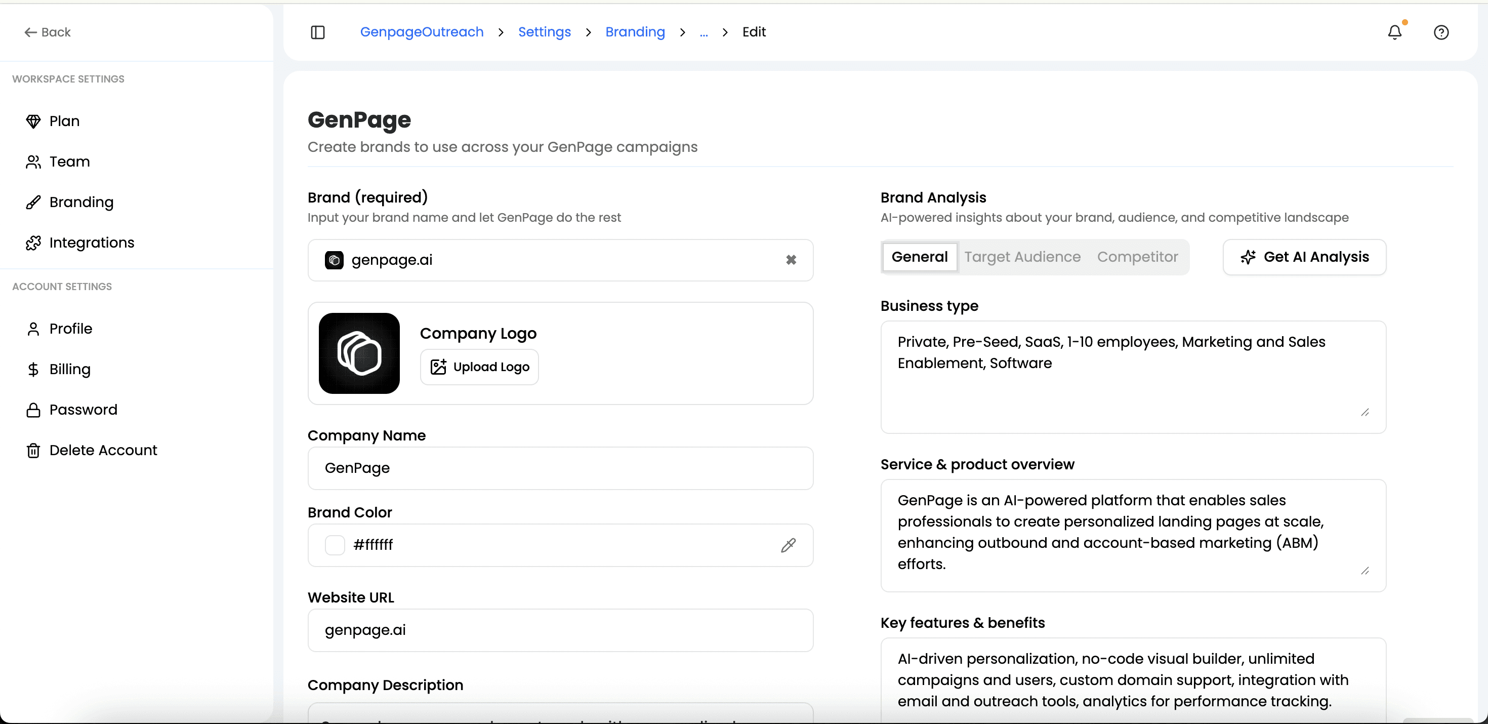 Write your prompt: GenPage will automatically reference your AI Brand Analysis and each lead's AI Insights to produce a hyper-personalized output for each lead.