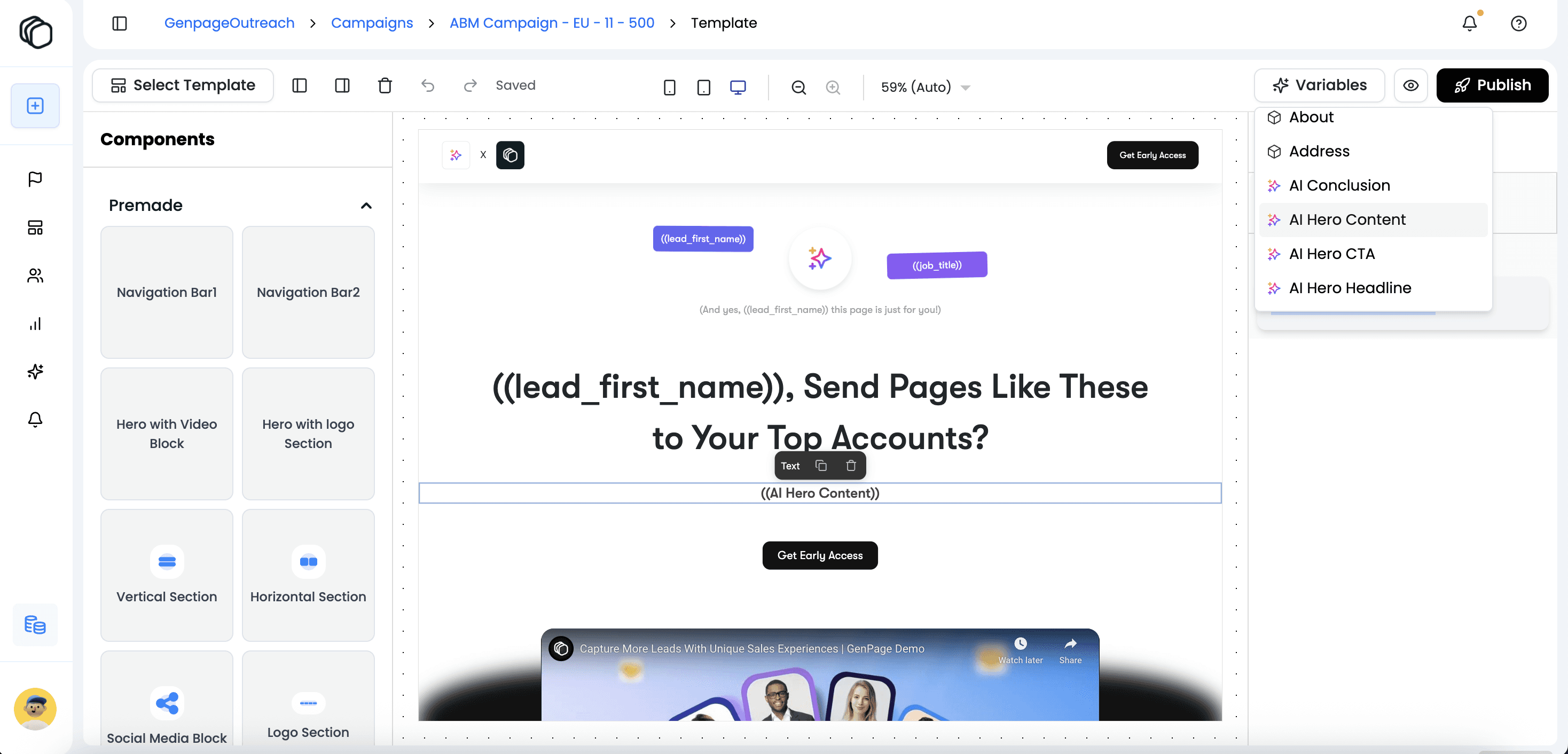 Once you're satisfied with your AI variables, it's time to place them on your landing page template. This will ensure each generated landing page features hyper-personalized, dynamic content, for every single one of your leads.